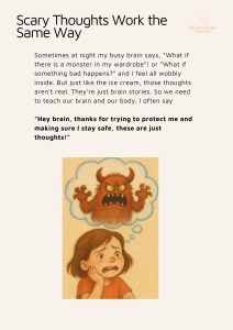 - Use the language of the workbook –Encourage your child to use phrases like “I’m having the thought that…” or give thoughts a silly name. This reinforces the idea that thoughts are separate from reality.